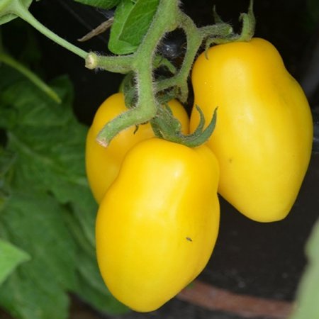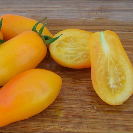 Οι ντομάτες είναι επιμήκεις και κυλινδρικές, με μετατοπισμένη κορυφή που δίνει στο κίτρινο ντομάτα σχήμα «μπανάνας».