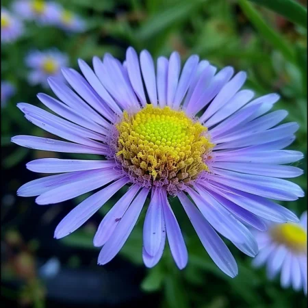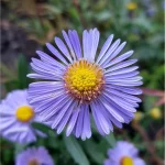 Многогодишно декоративно растение с едри, маргаритоподобни цветове в ясен синьо-лилав тон и жълт център.