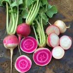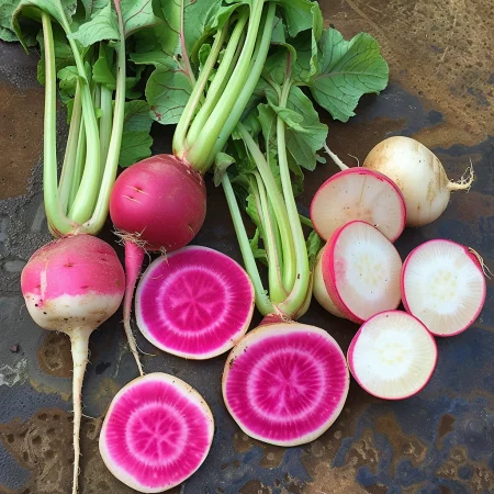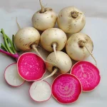 Εξοικονομείτε €2.61Атрактивен азиатски сорт ряпа/репичка тип „watermelon radish“ с бледа кора и наситено розово-червена вътрешност.